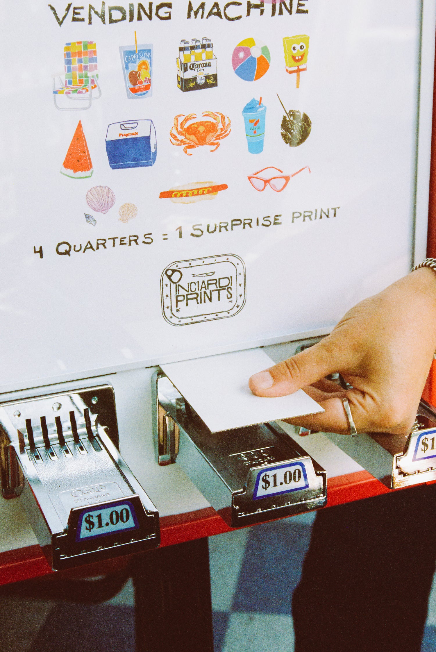 Ana Inciardi launched her first Mini Print Vending Machine in the winter of 2022. She dreamed up the idea back in 2020 to help her collect laundry money during a quarter shortage. Growing up in Brooklyn, Ana was inspired by nostalgic temporary tattoo vending machines that spilled out on New York sidewalks. Accessibility was the goal when developing the Mini Print Vending Machine, which prices each mini print at one dollar. There are now over 100 machines across the country, with more on the way. Check out the map to find the one closest to you!