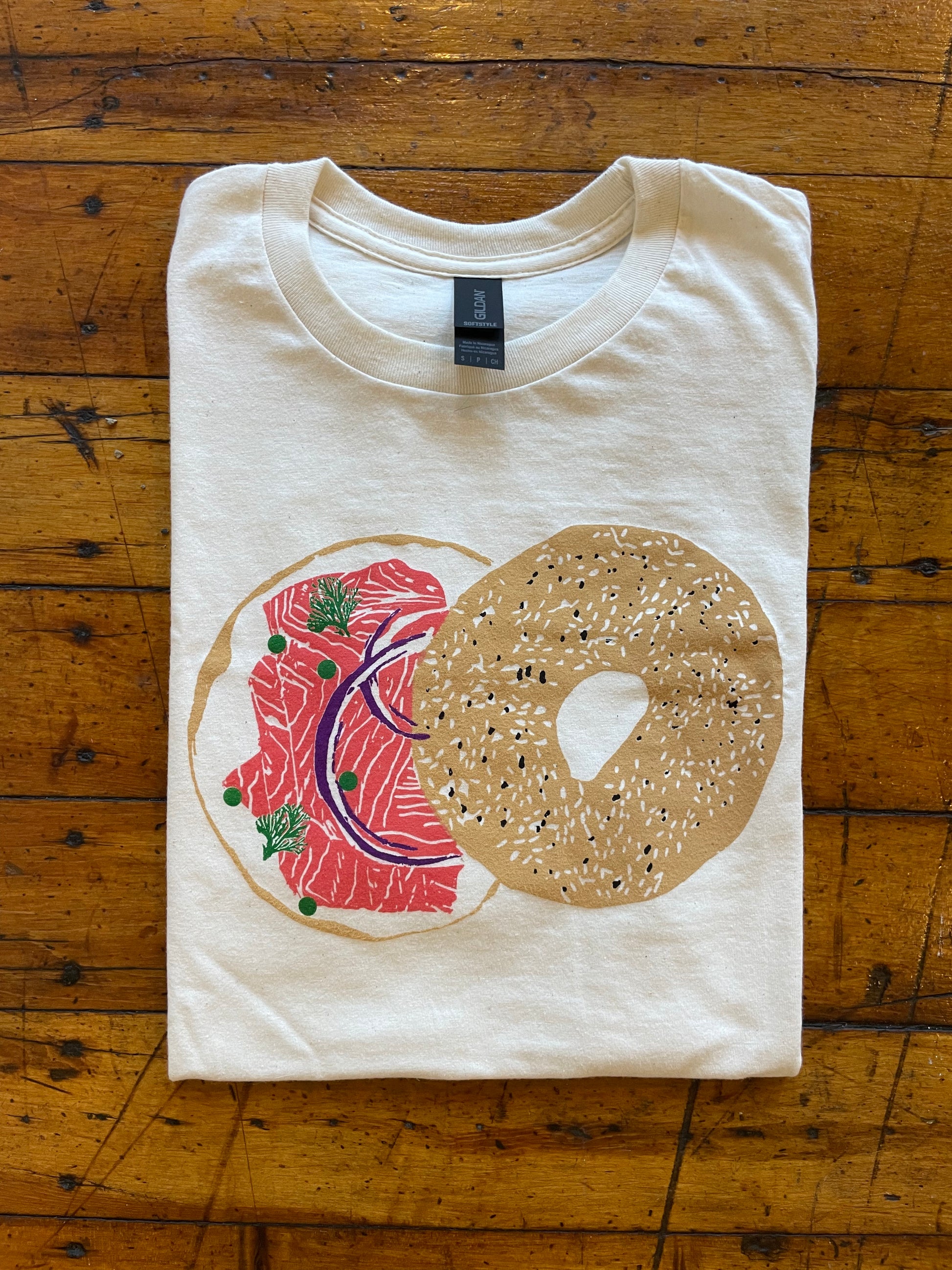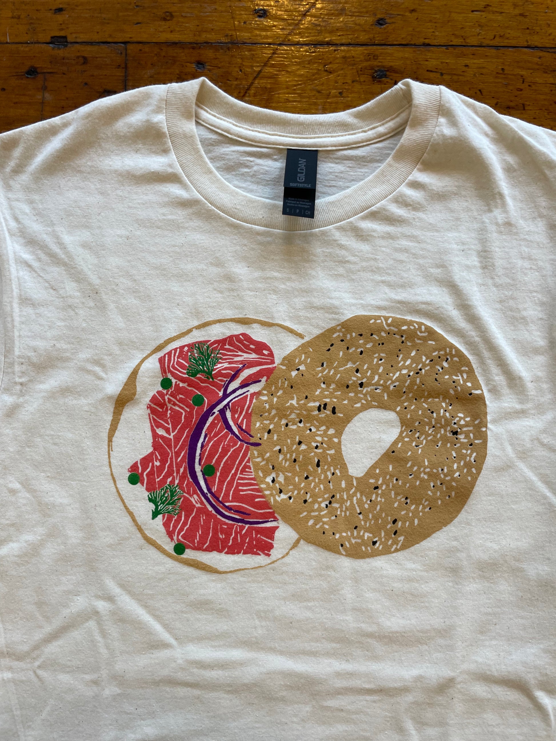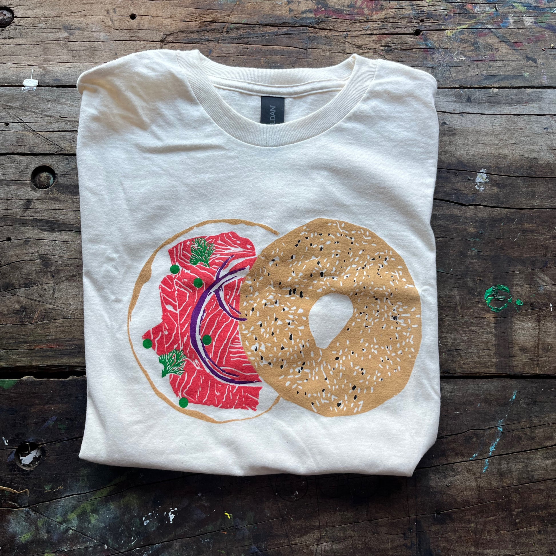 Five color screen-printed t-shirt by Craig Mountain Art of Ana's classic bagel with lox linocut.