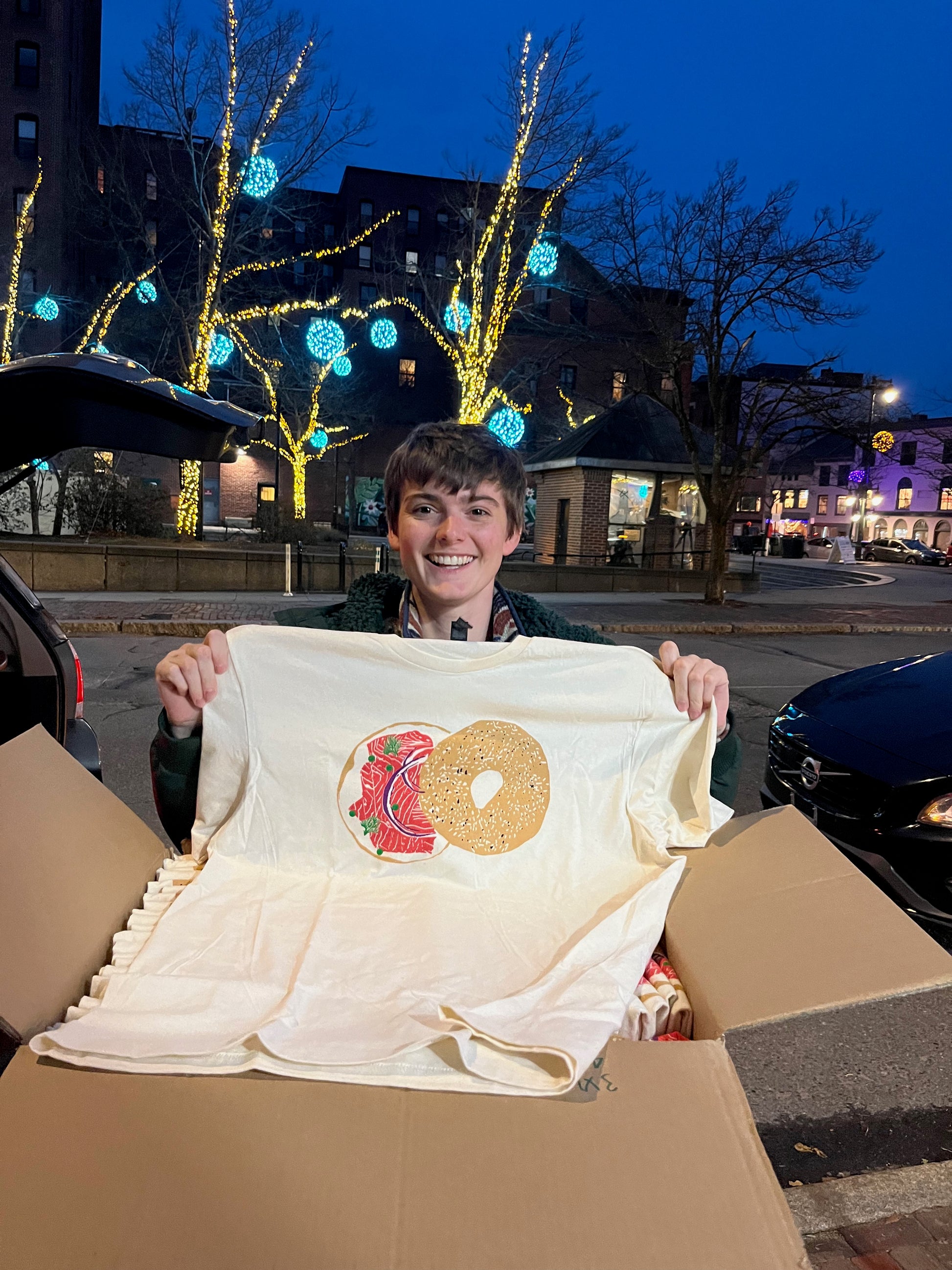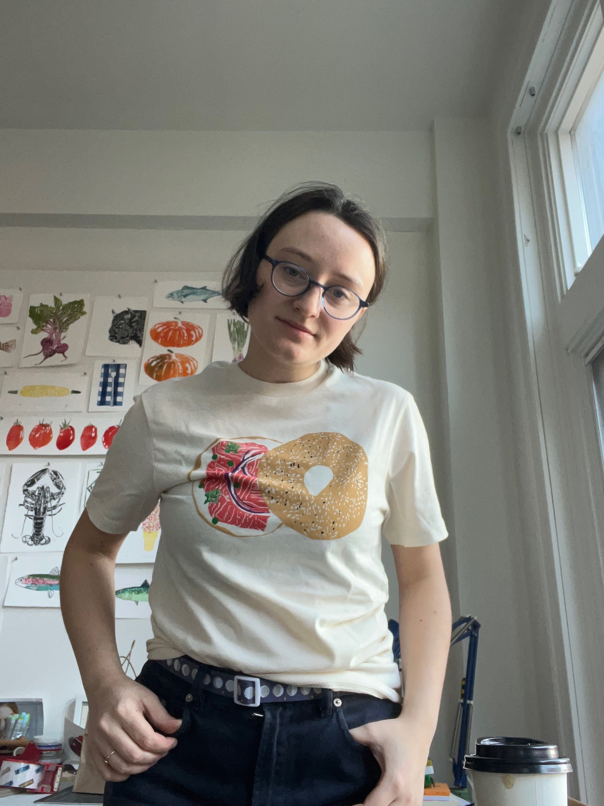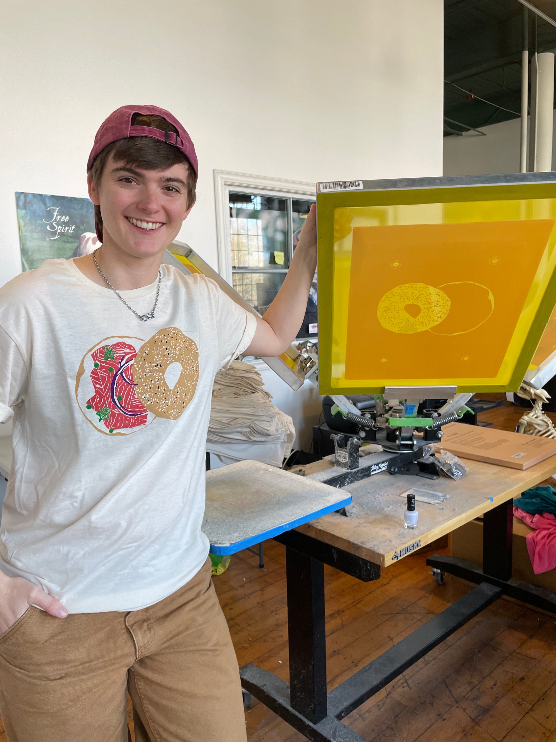Five color screen-printed t-shirt by Craig Mountain Art of Ana's classic bagel with lox linocut.