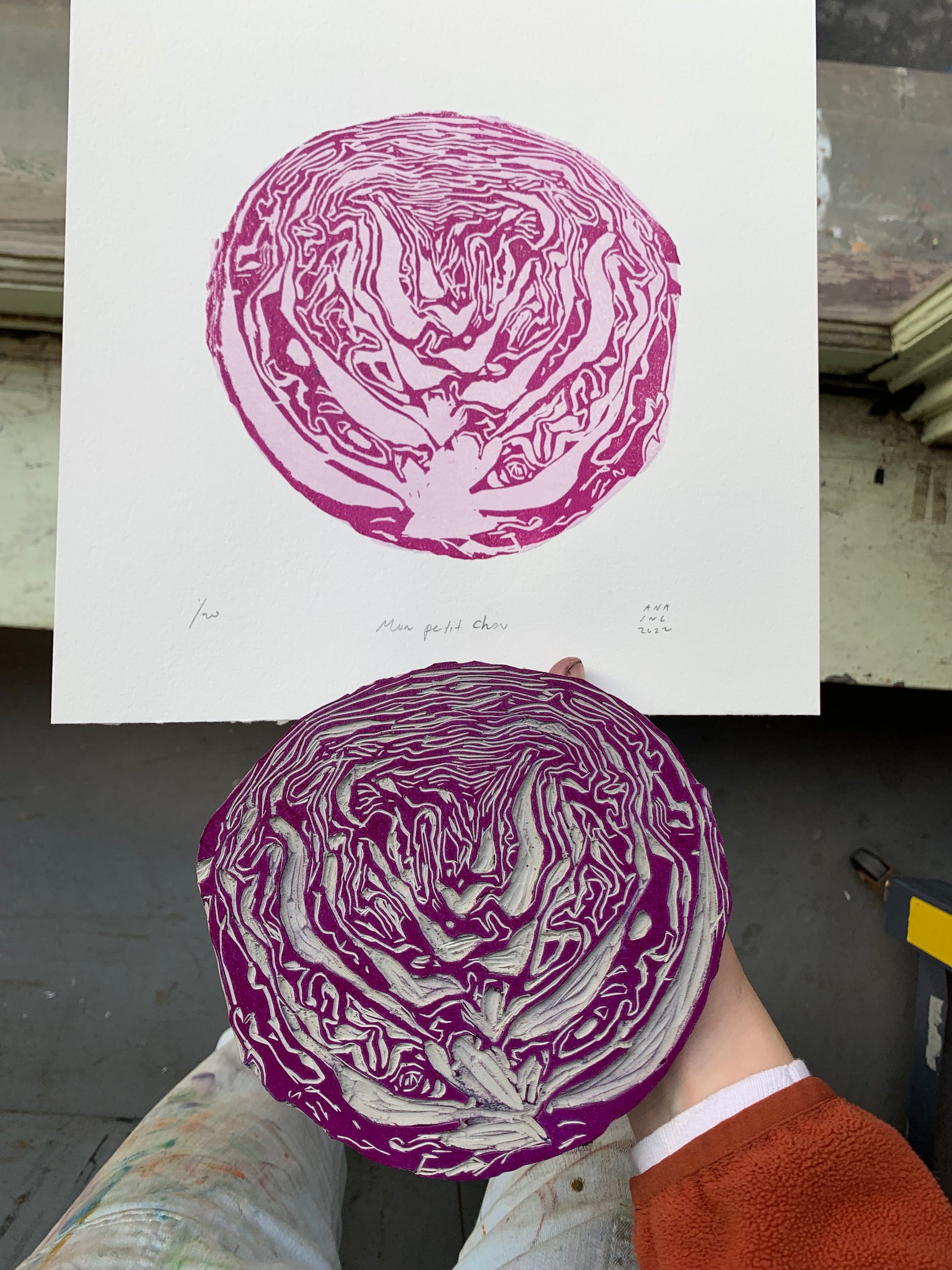 Hand-carved and printed linocut of a cabbage.