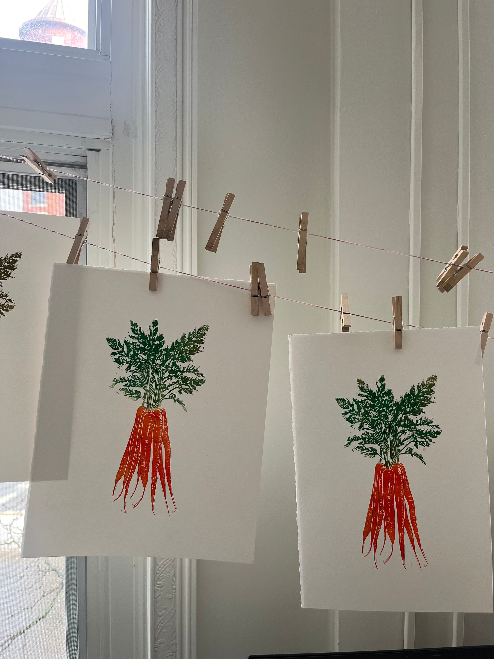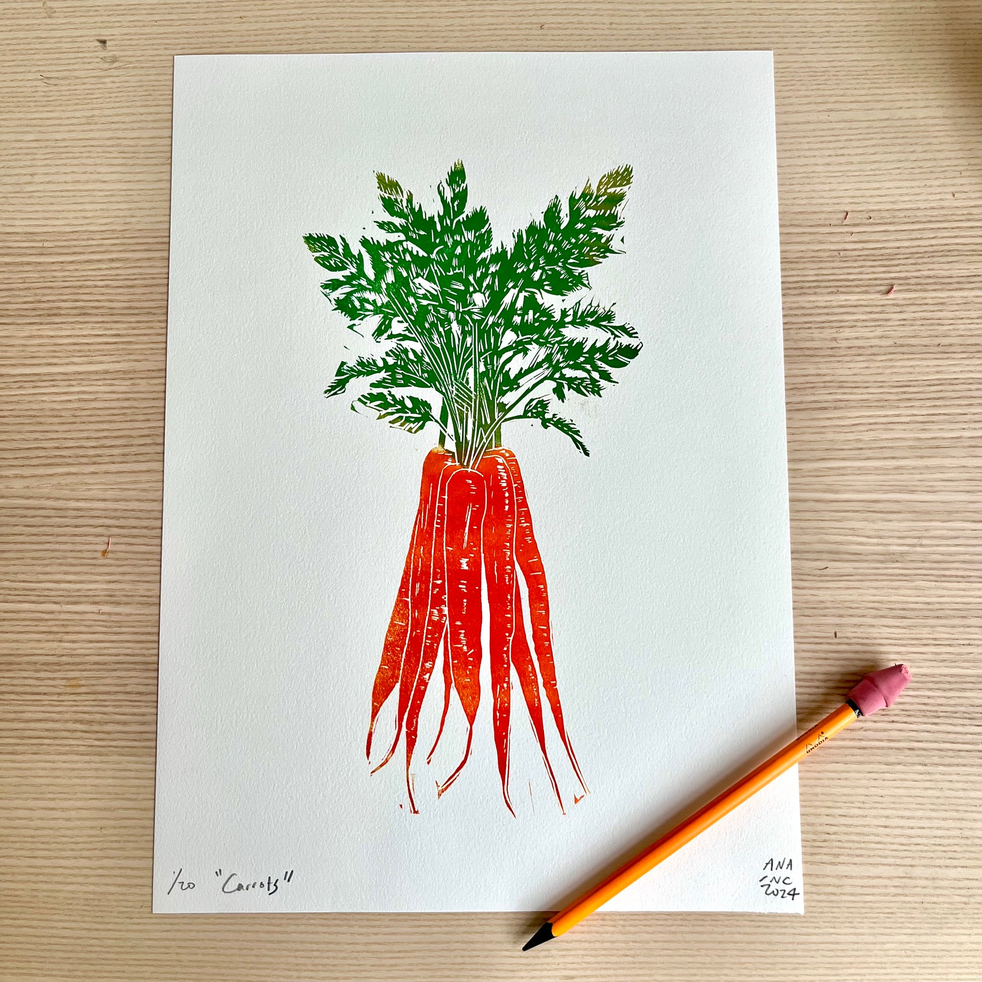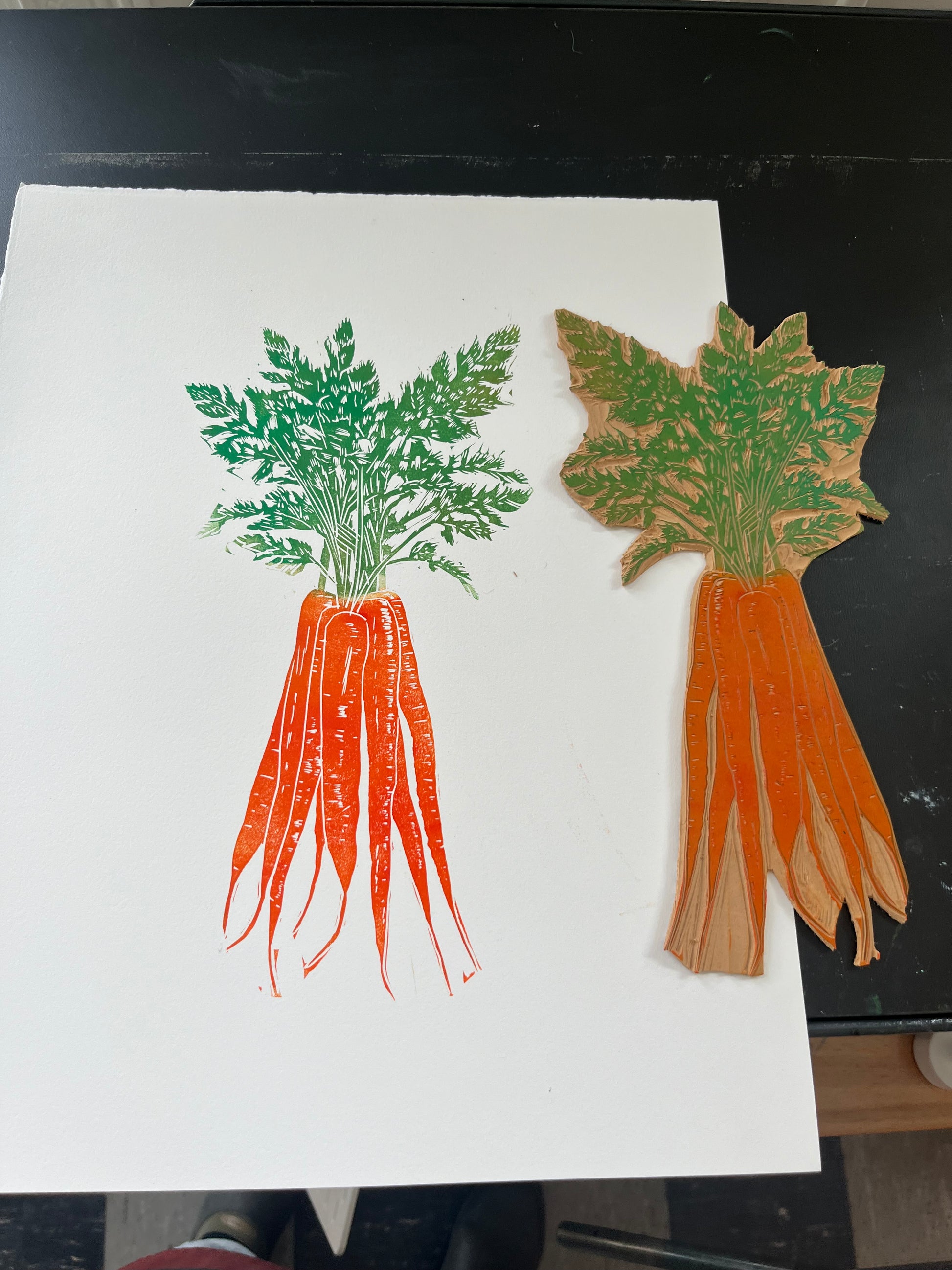 Hand-carved and printed two color/ one block linocut of some carrots.