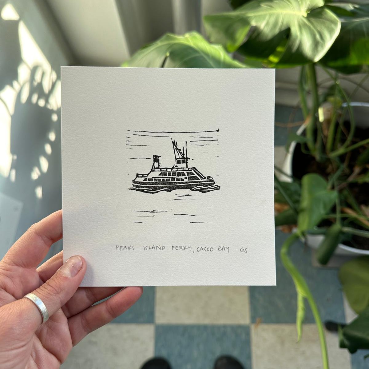 Hand-carved and printed single color linocut of the Peak's Island Ferry by Ana's assistant, Grace Stein.