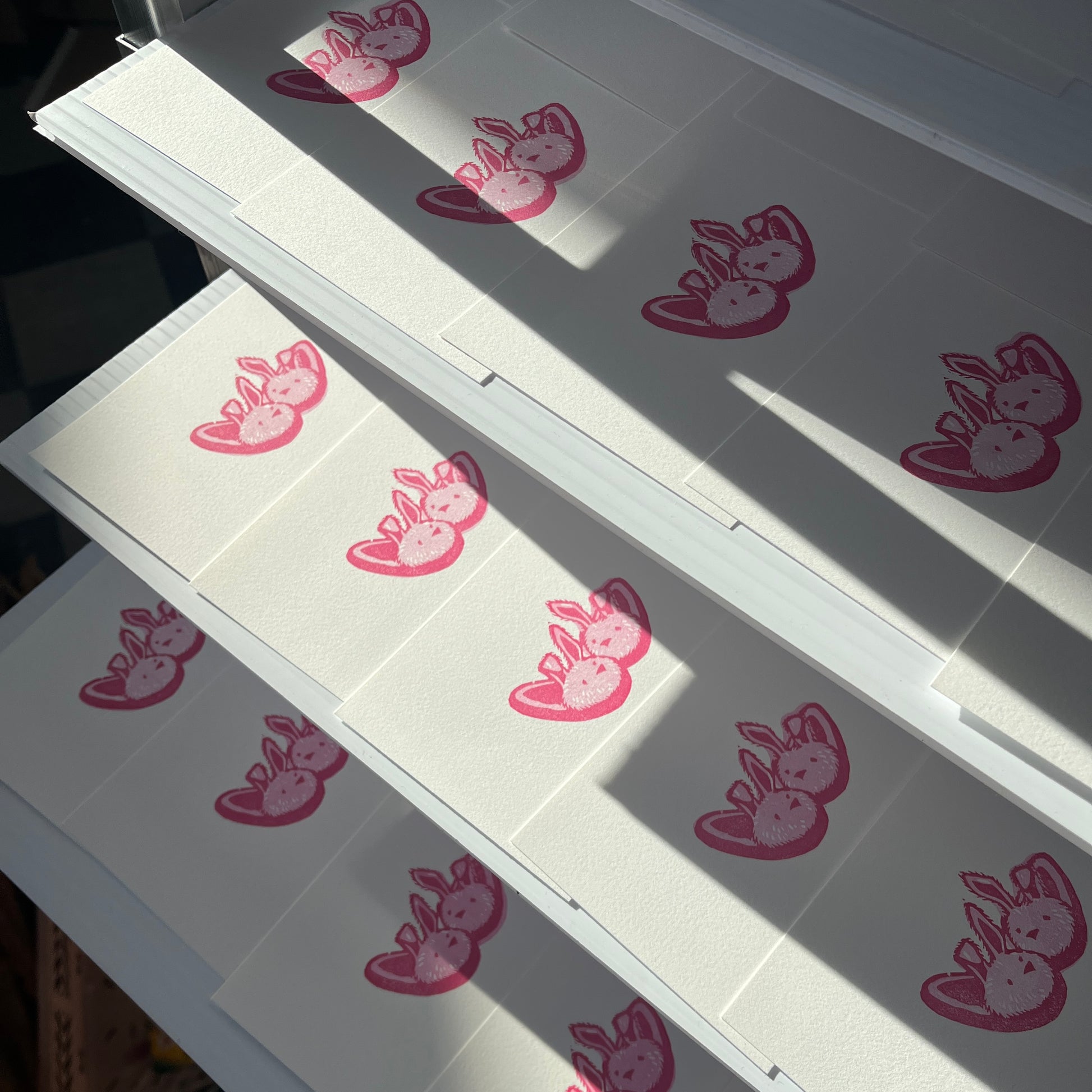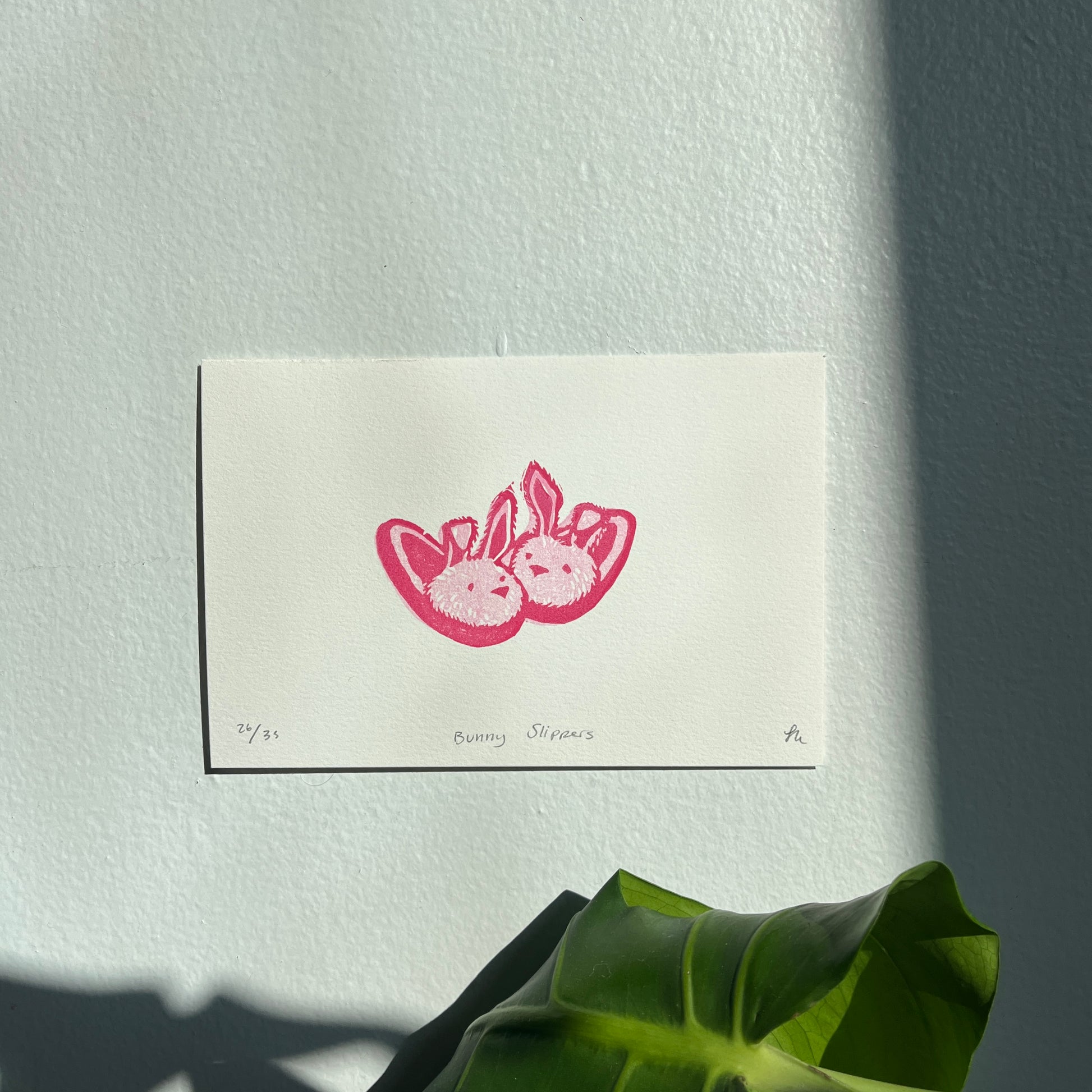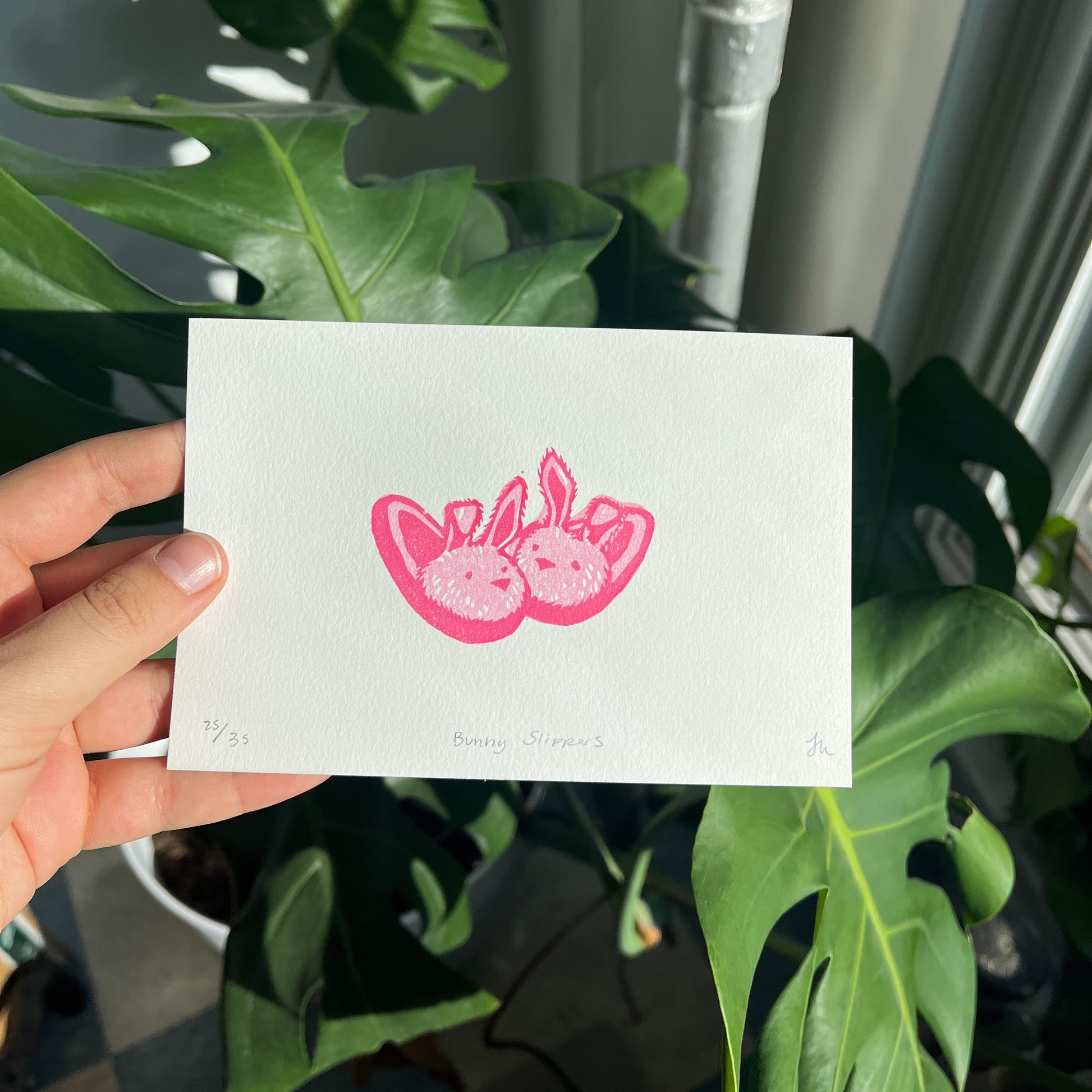 Hand-carved and printed two color linocut of cozy bunny slippers by Ana's assistant, Jana Heckerman.