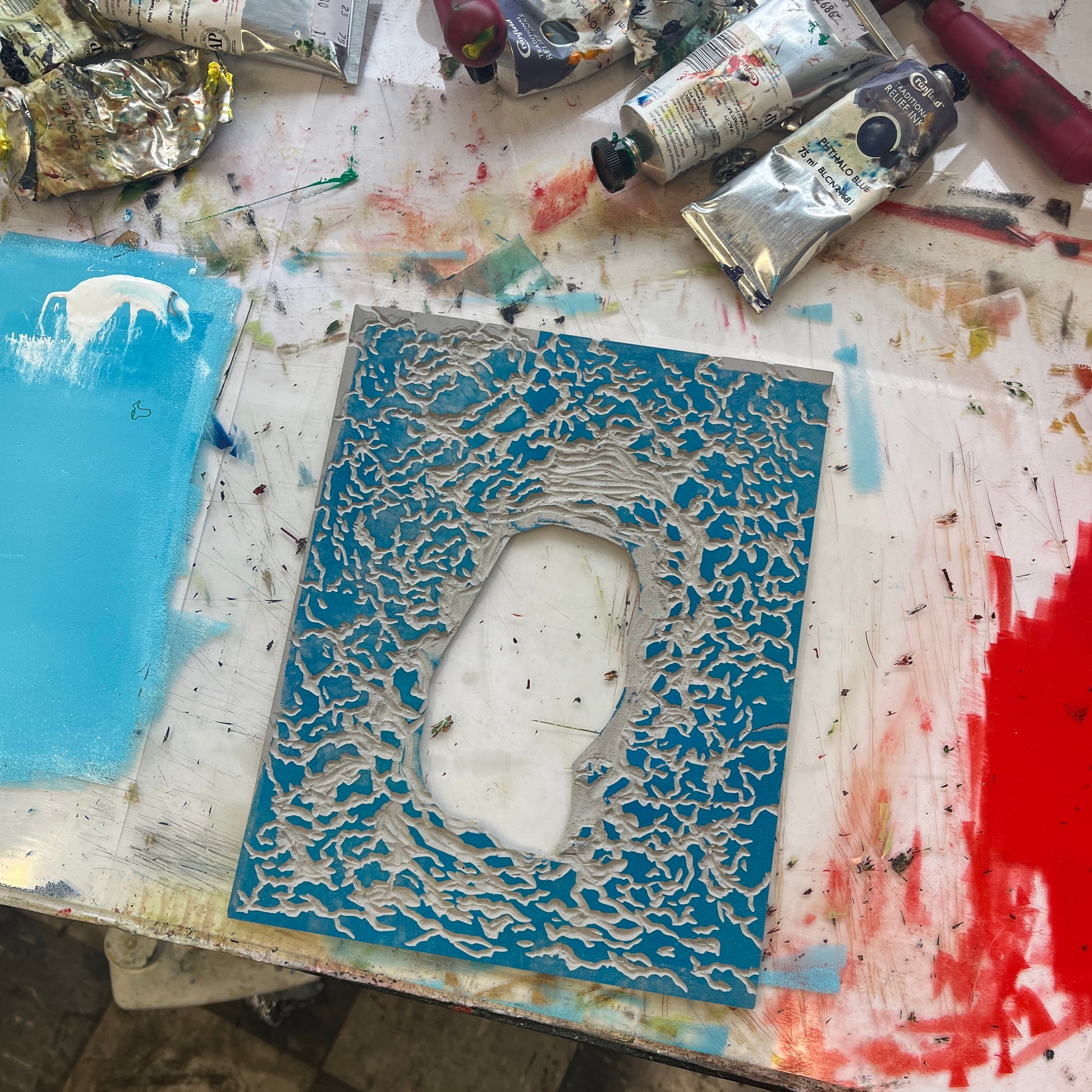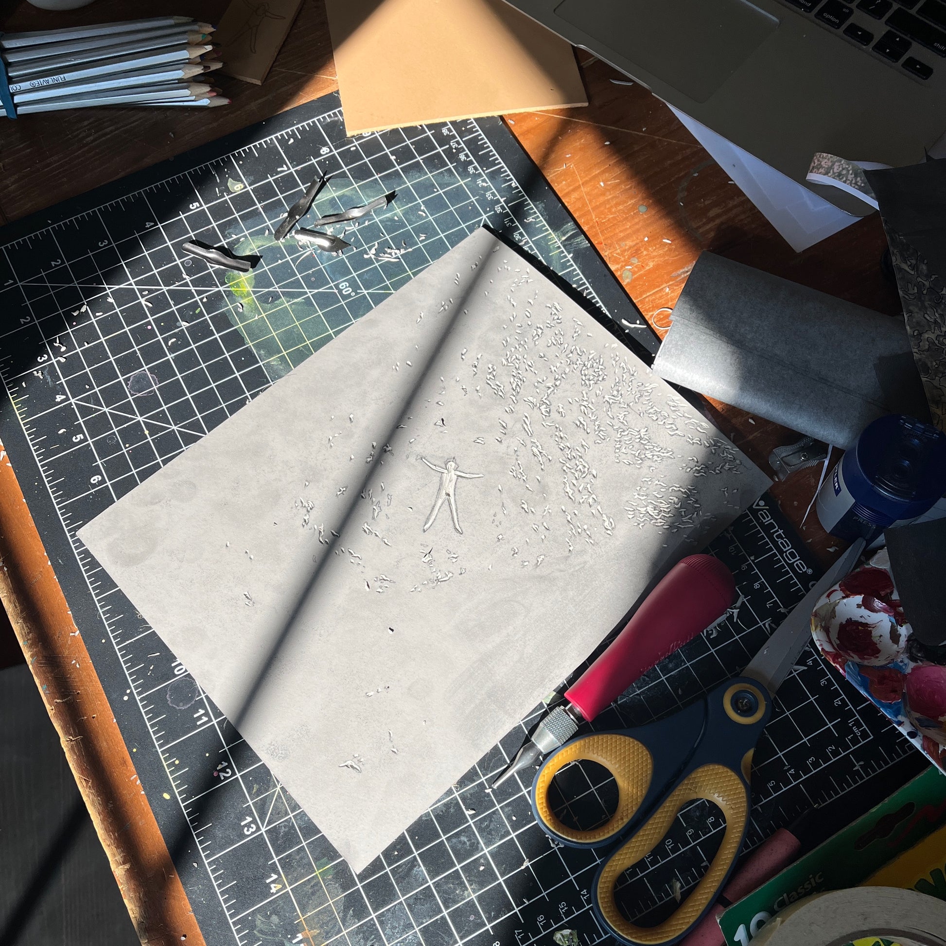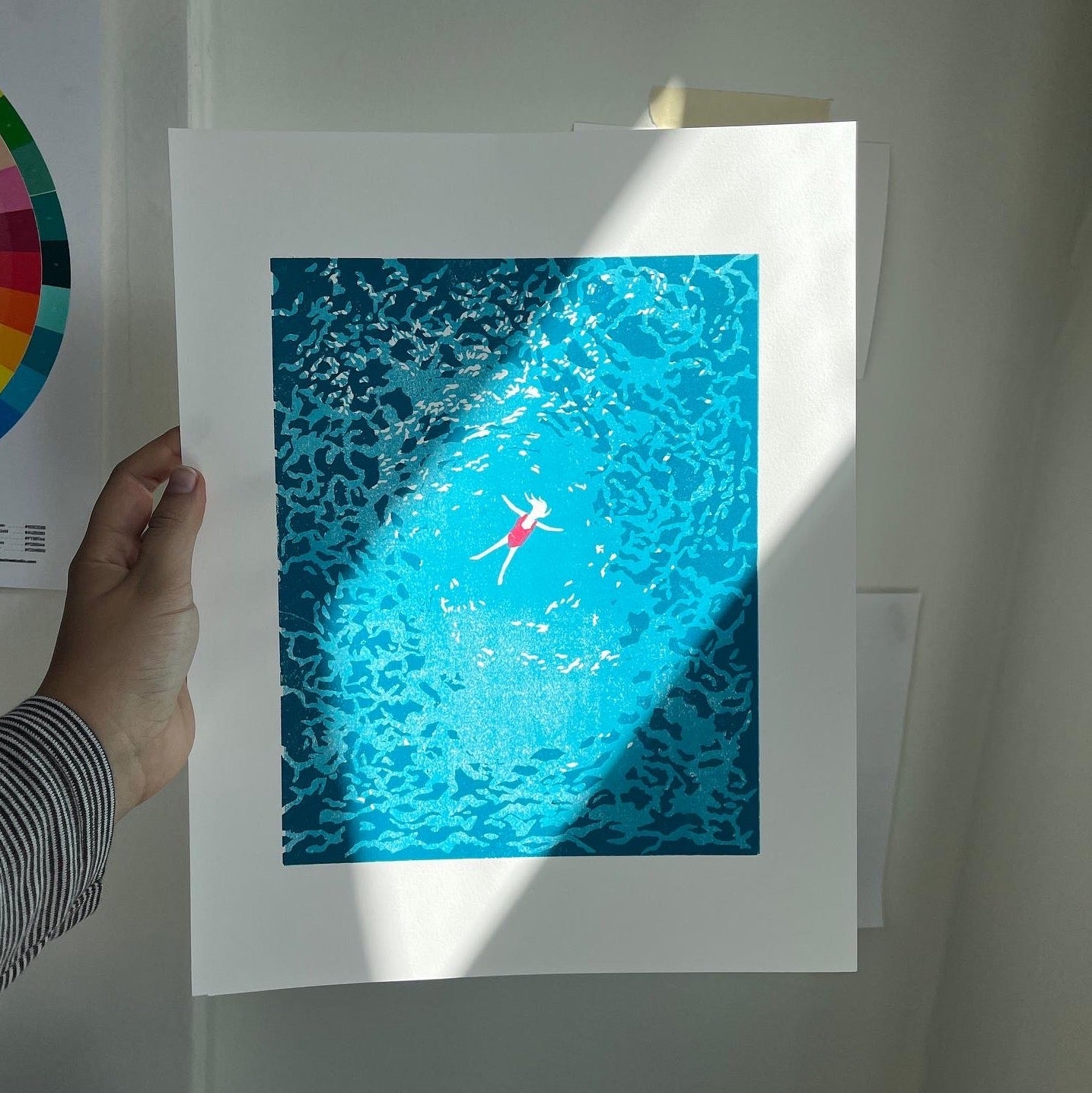 Hand-carved and printed three color linocut of a peaceful ocean float by Ana's assistant, Jana Heckerman.