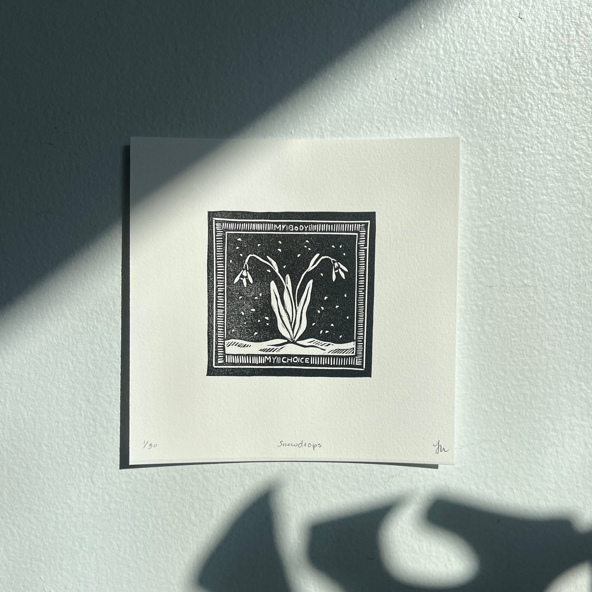 Hand-carved and printed single-color linocut of snowdrop flowers by Ana's assistant, Jana Heckerman. All proceeds from this print will be donated to SAFE Maine (safemaine.org), an organization that helps fund abortions and reproductive care for people in need in Maine and New England.