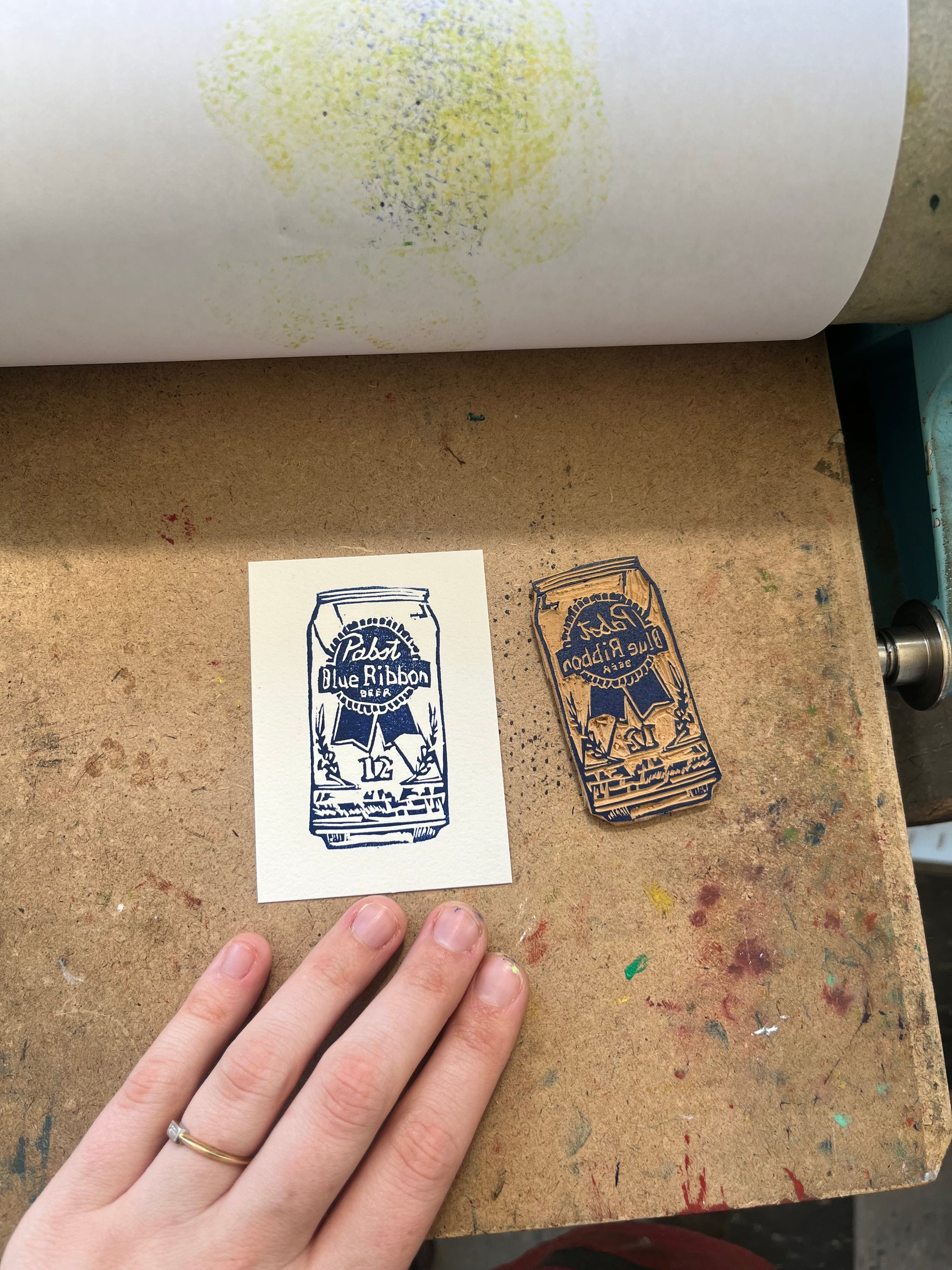 Hand-carved and printed 2 color linocut of a miniature PBR can!