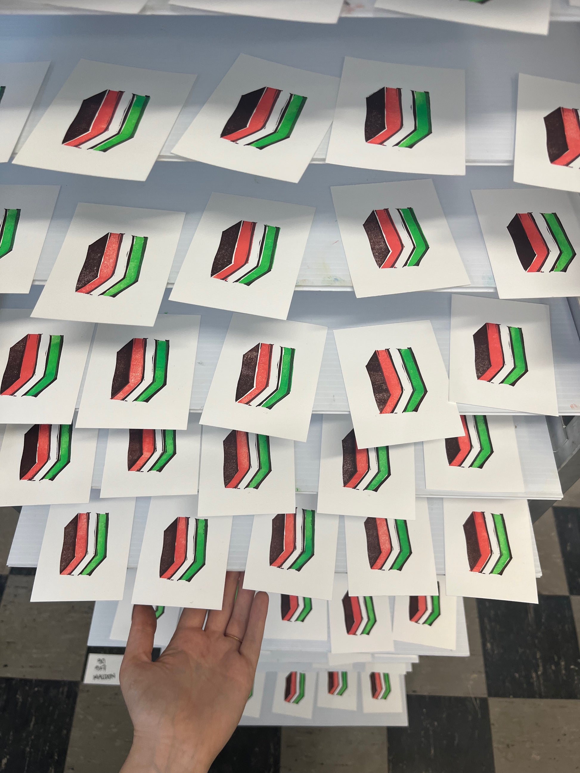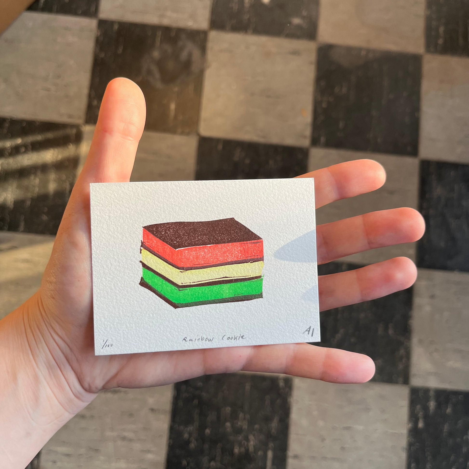 Hand-carved and printed four color/layer linocut of a rainbow cookie.
