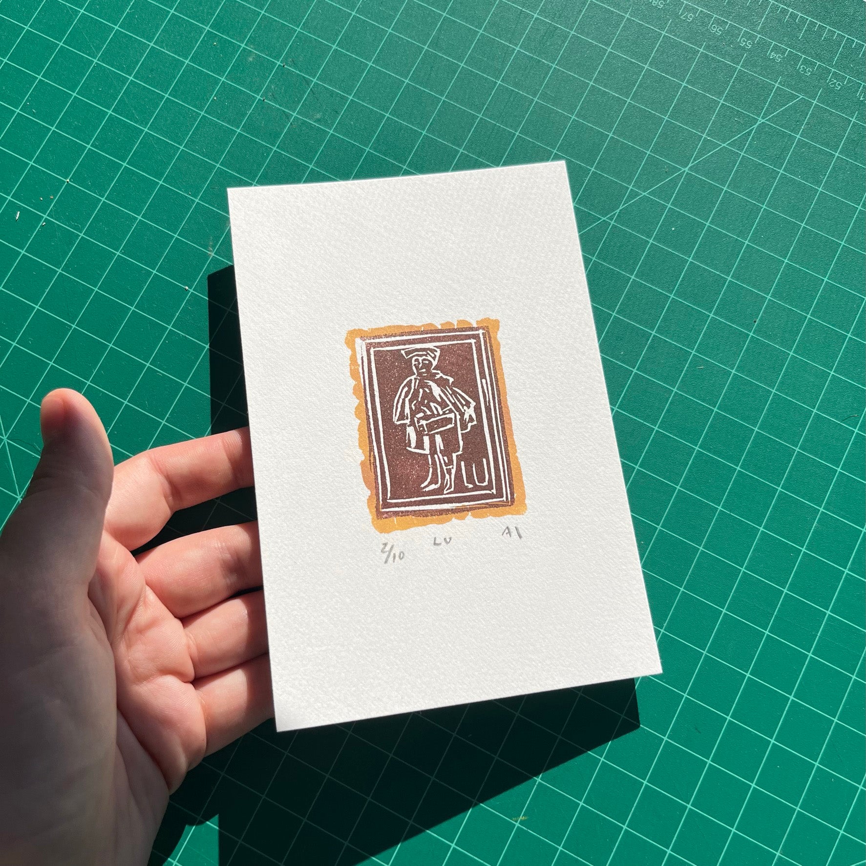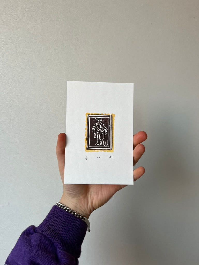 Hand-carved and printed linocut of a LU school boy cookie.