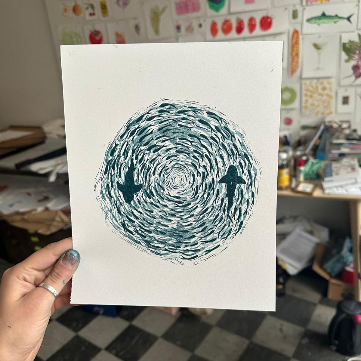 Hand-carved and printed single color, multi-layered linocut of sharks swimming through schooling fish by Ana's assistant, Grace Stein.