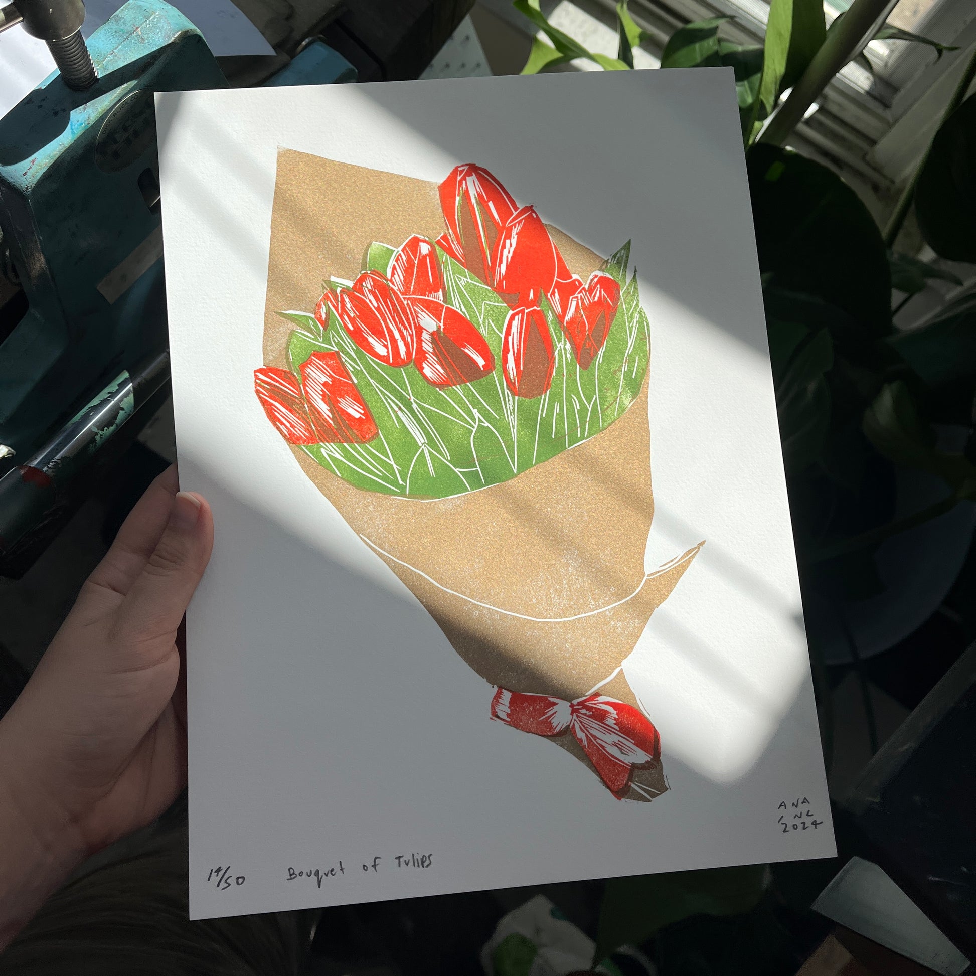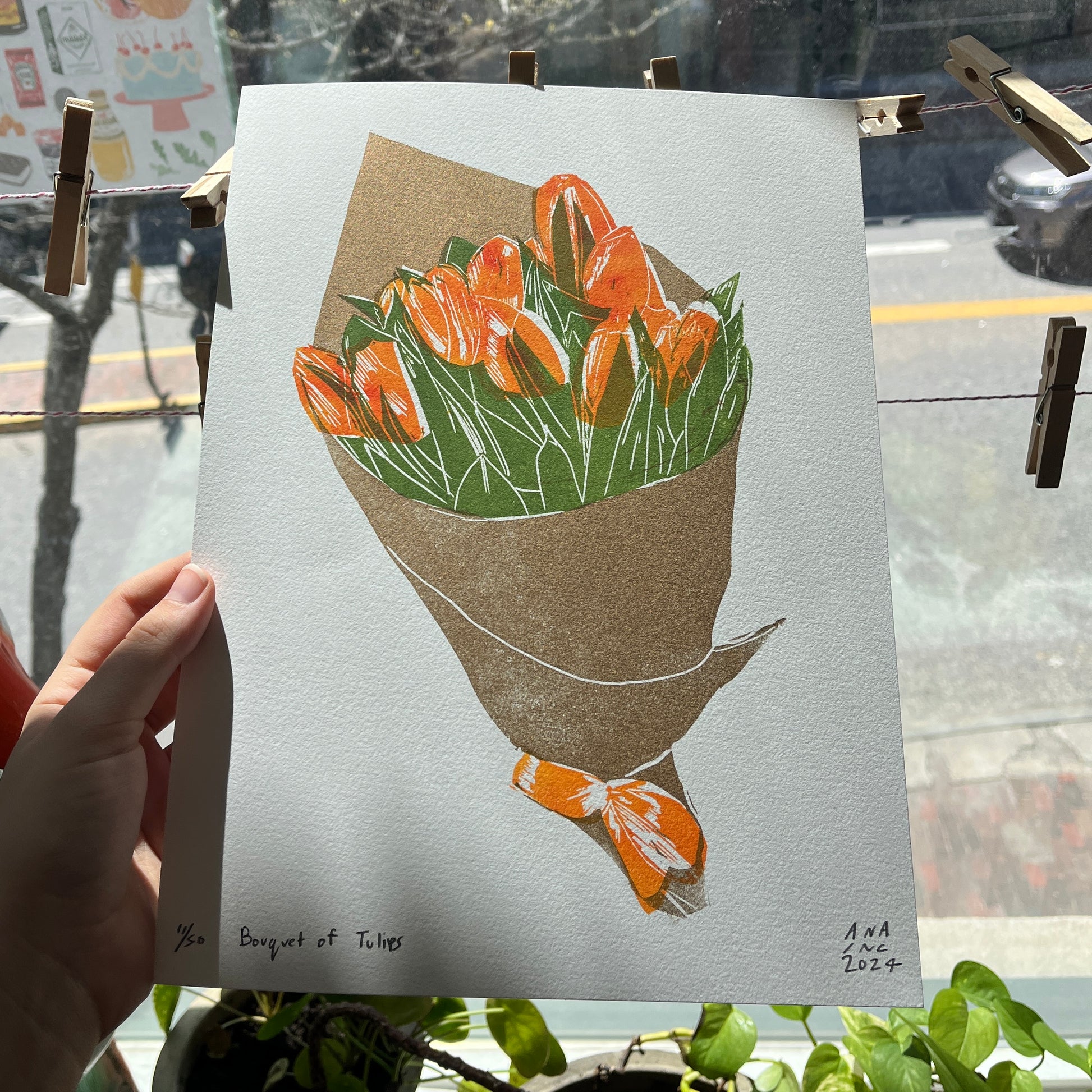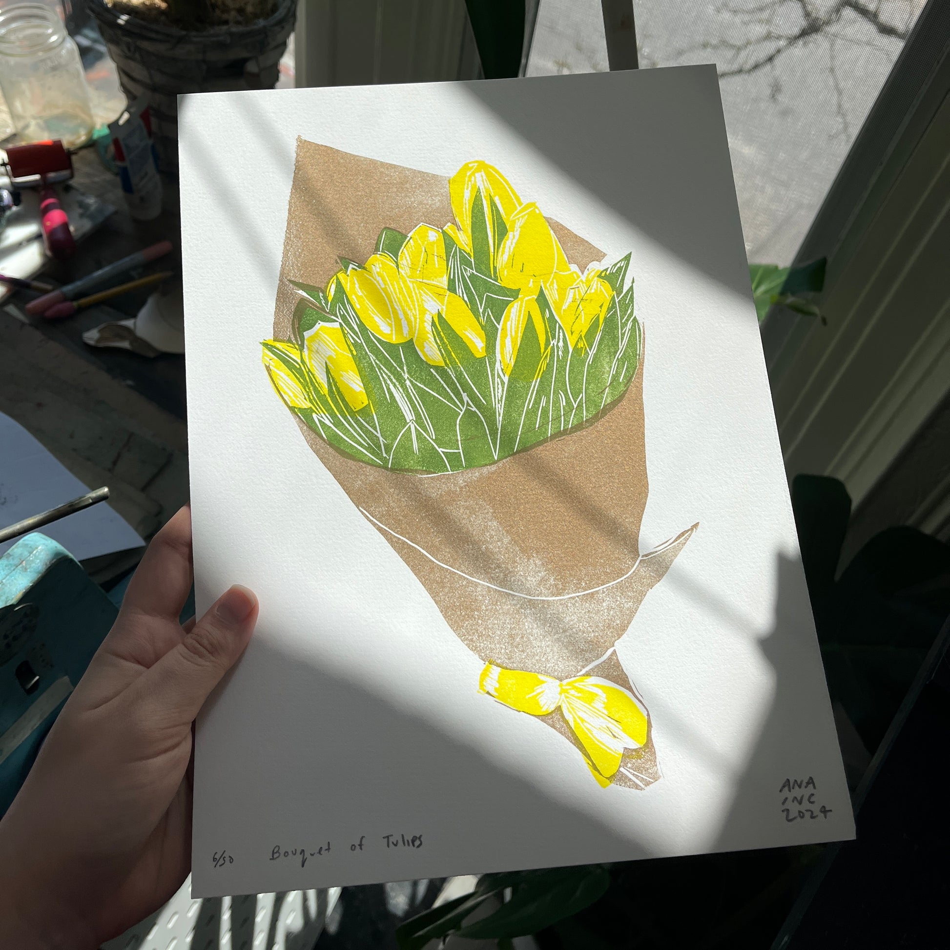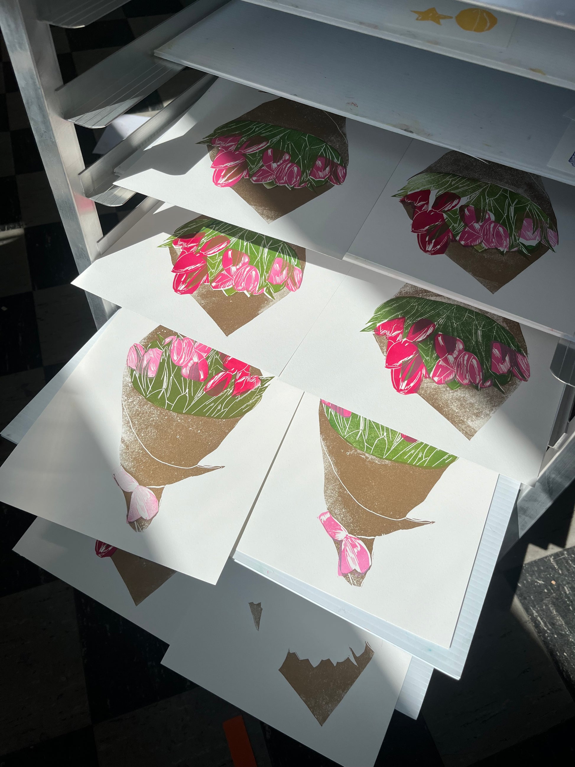 Hand-carved and printed 4 piece linocut of a bouquet of tulips.